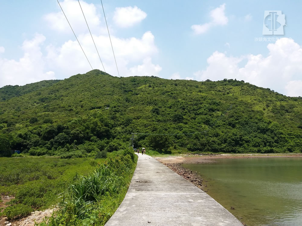 由荔枝窩碼頭出發向鎖羅盆村約2公里左右,沿著岸邊走了不久便入山,水泥路也變為石磴古道。往前走會經過一個山坳,當登上最高點時,眼前見到山下一條柏油路,把大片的紅樹林和沙頭角海分隔起來,鎖羅盆的目標已近在咫尺了。