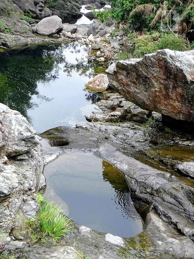 近看,有的壼穴上下相通,流水可穿孔而過;不通的就注滿了水,相信若在雨季定必溢瀉而出;較大的可整個人鑽進去,較小的則可穿過手或脚。