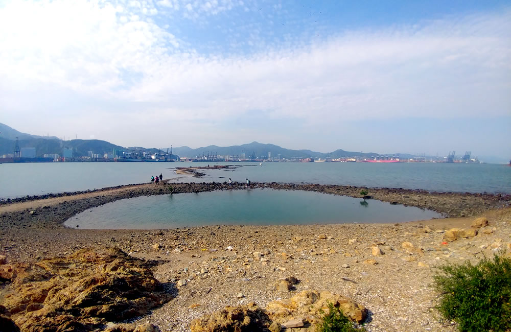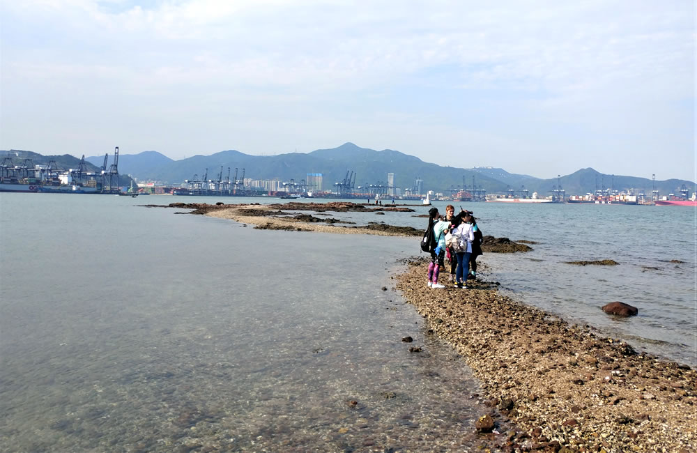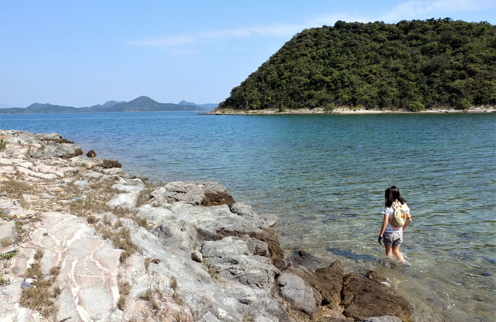 終於到了長排頭,在大水退的時候,這裏便會出現一條長長的岩礁和一個大潮池,岩礁盡頭有一座燈塔。而大潮池便成了行山人的打卡熱點「人間天池」,詠雪二話不說便行入了天池。