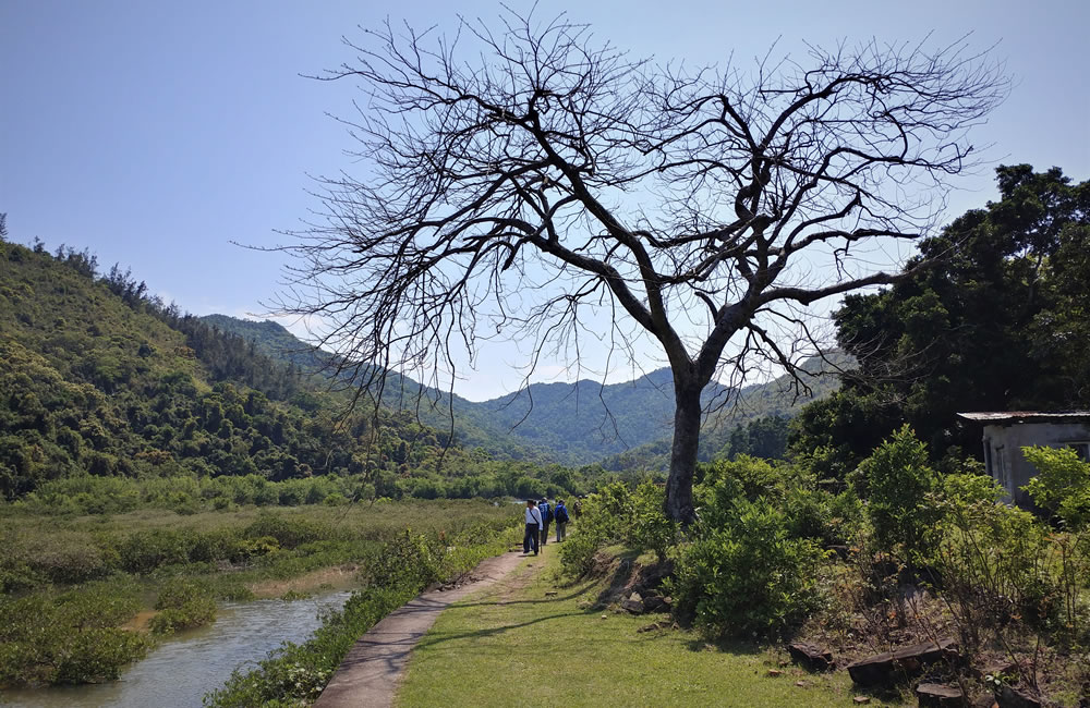 村口的鳳凰木全落葉,剩下枝條,斯人獨憔悴。走出堤壩,昔日魚塘已變成一片紅樹林。