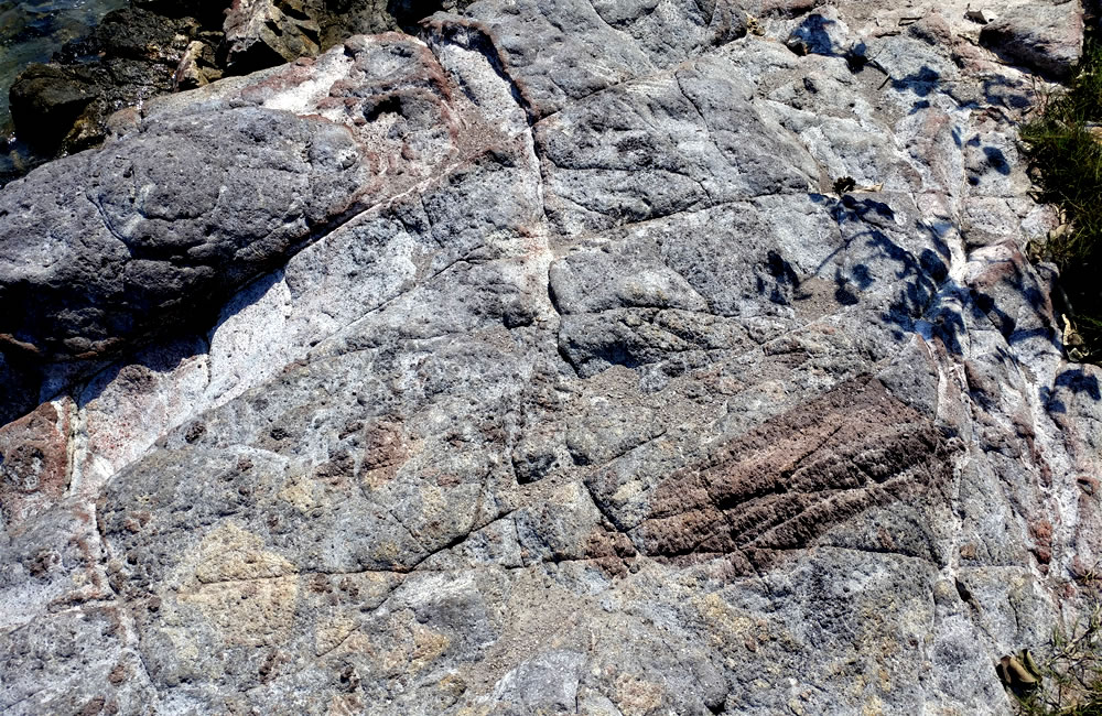 續綑行到上角咀,看見灰白色的凝灰岩(火山灰)夾雜一些啡紅色岩塊,細看下,這些呈流紋狀的岩塊是火山熔岩,已有1.64億年歷史,出露在新界東北的熔岩並不多。