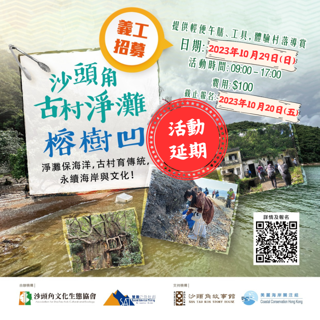 原定於8/10舉行的「沙頭角古村淨灘活動—榕樹凹」,由於受到熱帶氣旋🌬️的影響,需要延期至29/10舉行。由於部分參加者未能出席延期活動,因此現有活動名額可以重新開放給公眾報名參與。