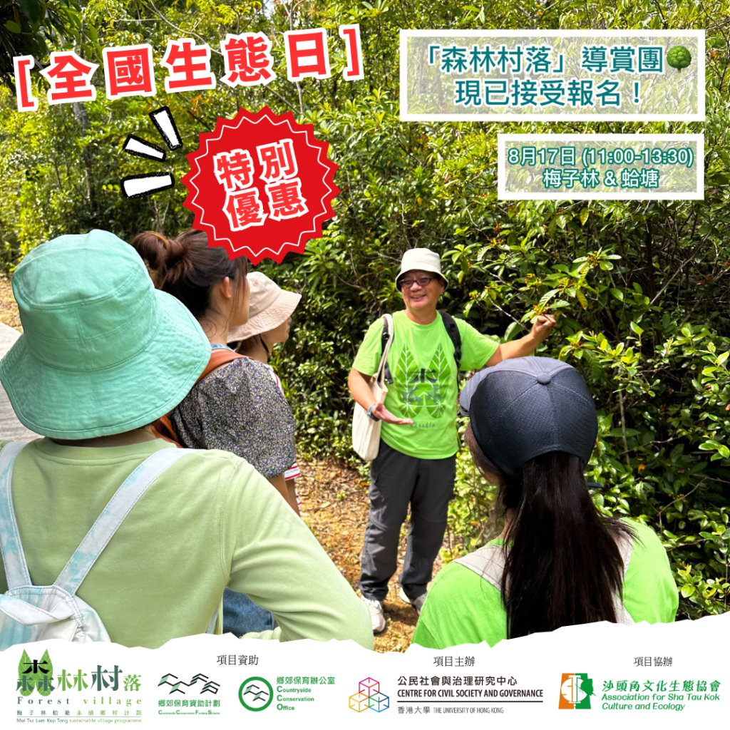 首場活動「森林村落導賞團- 梅子林及蛤塘生態文化之旅」將於8月17日(六)舉行。我們將帶領參加者認識2條客家鄉村的動植物🌿及生態特色,並介紹當地的客家文化👩🏻🌾,引導參加者了解保護鄉郊生態環境的重要性。