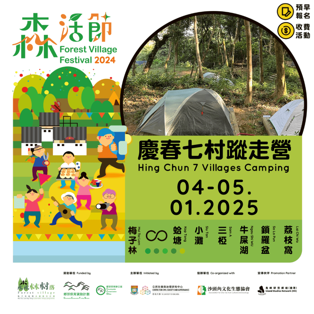這次森活節將首次舉辦「慶春七村蹤走營」,營友在梅子林營地執拾好行裝後🧳,將跟隨領隊行走大約10公里的古道👣,探訪梅子林、蛤塘、小灘、三椏、牛屎湖、鎖羅盆及荔枝窩的迷人風光🌄,並感受獨特的客家村屋文化🏡,完成後晚上將於荔枝窩享用豐富的客家晚宴🍽️,最後返回營地梳洗及休息💤。