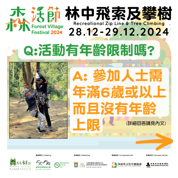A: 參加人士需年滿6歲或以上👦🏻🧒🏻,現場設有兒童攀樹安全帶給年紀較小的朋友穿著。活動並沒有年齡上限,由於活動涉及攀爬、高速滑動,參加者應按自己身體狀況,考慮是否參加。