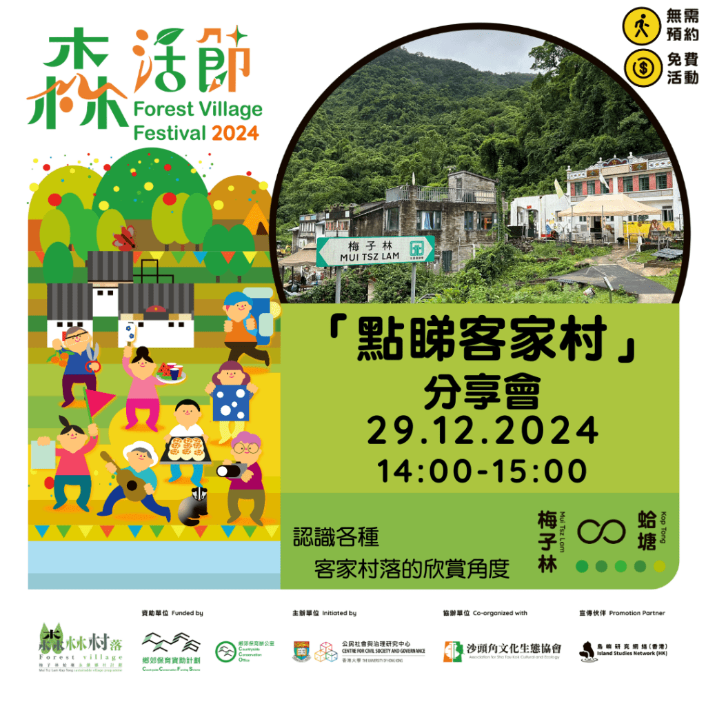 森活節2024為鄉郊保育資助計劃下的「森林村落︰梅子林及蛤塘永續鄉村計劃」的項目之一,通過一系列的文化和導賞活動,讓公眾親身認識並體驗梅子林與蛤塘的復育和活化,感受森林村落的不同可能,並鼓勵公眾參與,一同守護森林村落。