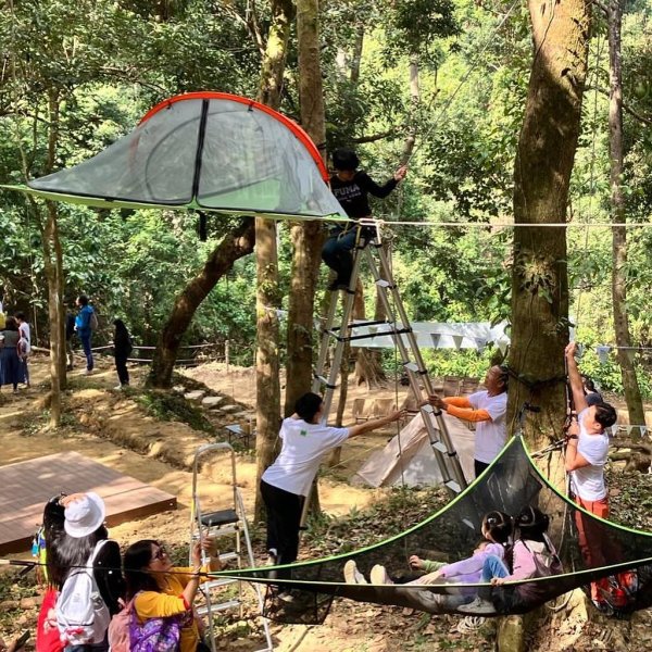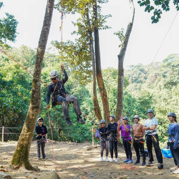 參加者在專業指導下於營區内挑戰康樂攀樹和飛索,在力量、毅力和勇氣的加持下,挑戰自我,一邊在高空俯瞰村内之美,一邊感受滑索快感。