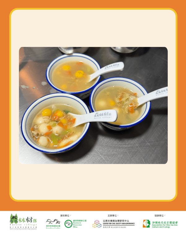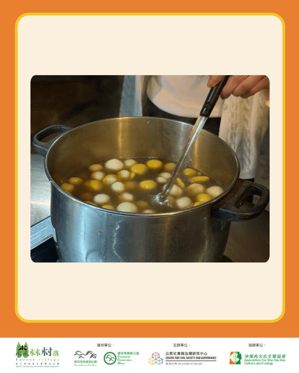 晚飯過後,參加者們移師至的記士多,一同製作客家鹹甜湯圓🍡。我們特別感謝荔枝窩新村民 Carol 親自教授每個製作步驟,更預先煮好鹹湯圓的高湯和甜湯圓的薑湯,讓製作過程更為順利。大家分工合作,合力揉麵團和放入冰糖,最終大約半小時內完成整個過程🙌🏻!大家隨即品嚐自家製的湯圓,感受冬至前夕的絲絲暖意!