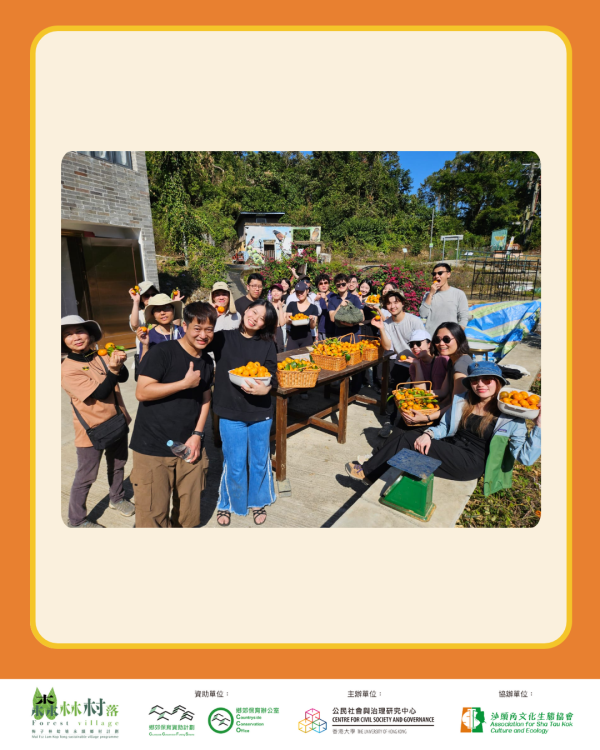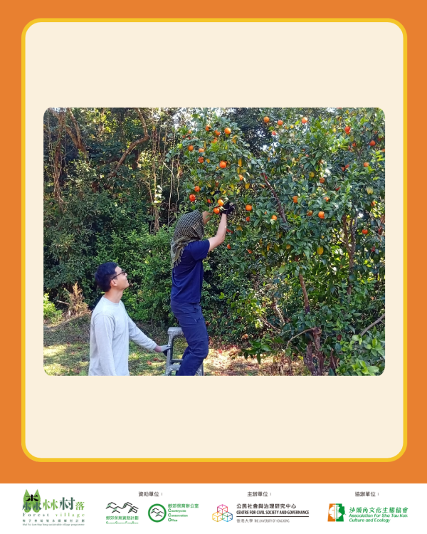 第二天臨退營前,團隊悉心安排了摘柑和桔環節🍊,象徵冬至平安。當日恰逢曾村長返回梅子林村,他隨即領導參加者們一起採摘🤩。大家手持工具,努力摘取柑桔帶回家中分享給其他親友,採摘過程間還不忘與村長交談與拍照留念。