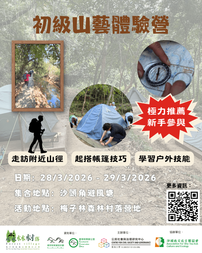 在這裡,您將到訪梅子林「森林村落」營地🏕️,由合資格山藝教練陳漢棠先生(棠哥)親自指導基礎山藝知識和搭建帳篷帳幕技巧🛠️。無論是裝備準備🎒、路線規劃🗺️,還是緊急應變🆘,教練都會大方分享這些實用技巧💡。您還有機會親自搭建帳幕,為晚上的安睡做好準備😴。此外,您將跟隨教練探索附近的山徑🔍,走訪蛤塘和小灘等客家村落,親身實踐所學的山藝技巧✨。