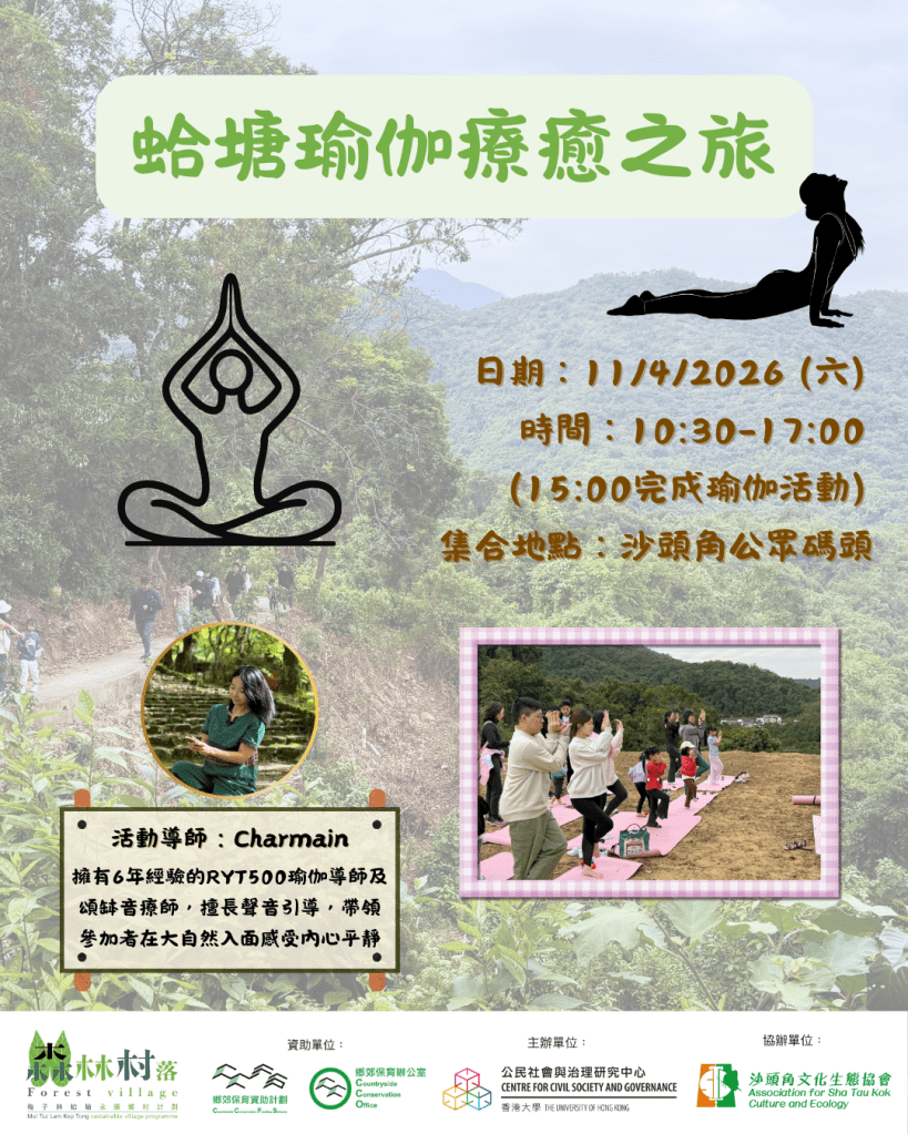 4月11日 (星期六),我們將於蛤塘舉辦一場瑜伽療癒之旅🧘,讓大家沉浸於大自然的懷抱中🍃。蛤塘位於新界東北的森林村落,四面環山,靜謐如世外桃源🏞️。旅程將由熱愛鄉郊的瑜伽導師Charmain @yogasiumui 親自帶領👩🏫。她擁有6年教學經驗,是RYT500瑜伽導師及頌缽音療師,擅長以聲音引導融合瑜伽與頌缽,強調內在體驗多於外在形態。當日會帶大家深入森林古村🌲,在蛤塘草地上進行兩小時瑜伽療癒——由流動瑜伽打開身體、陰瑜伽釋放深層壓力、再以頌缽音療🔔沉澱身心,徹底放鬆💆🏻♀️。